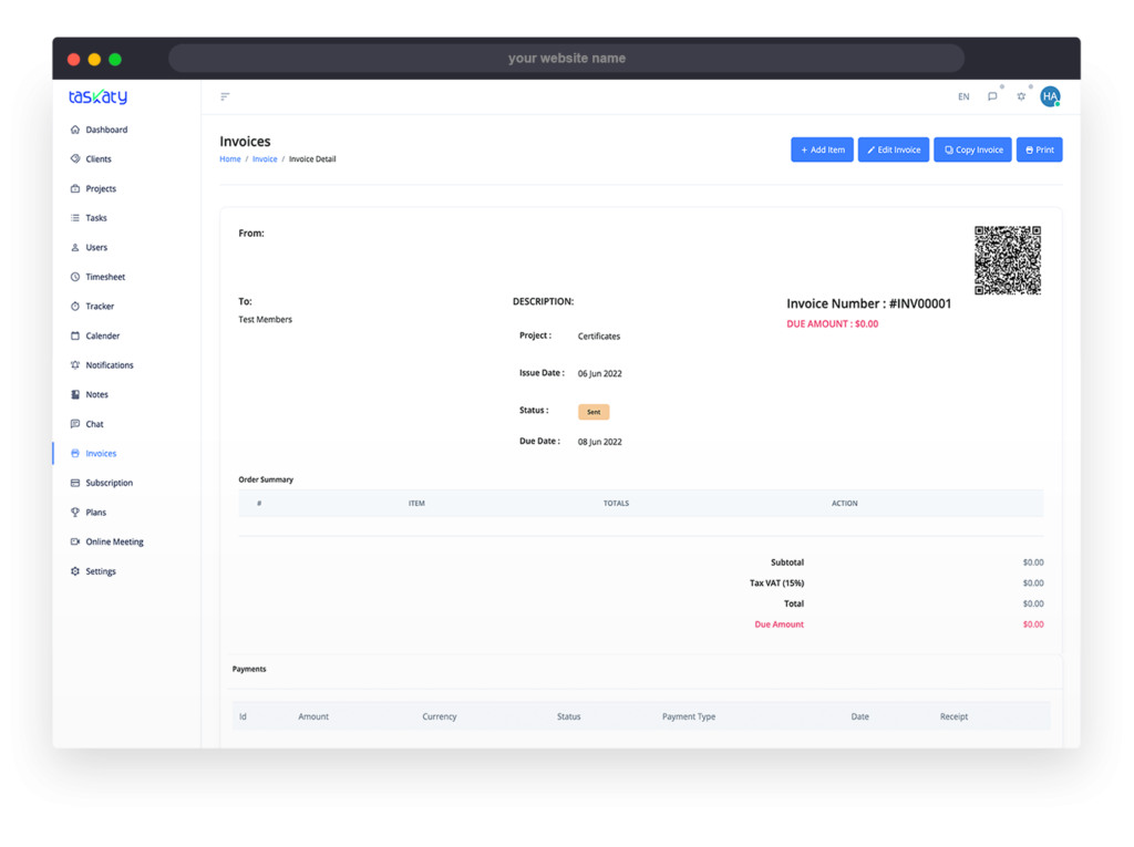 Use the built-in invoicing and PayPal and stripe integration to get paid for your work without leaving Taskaty.
